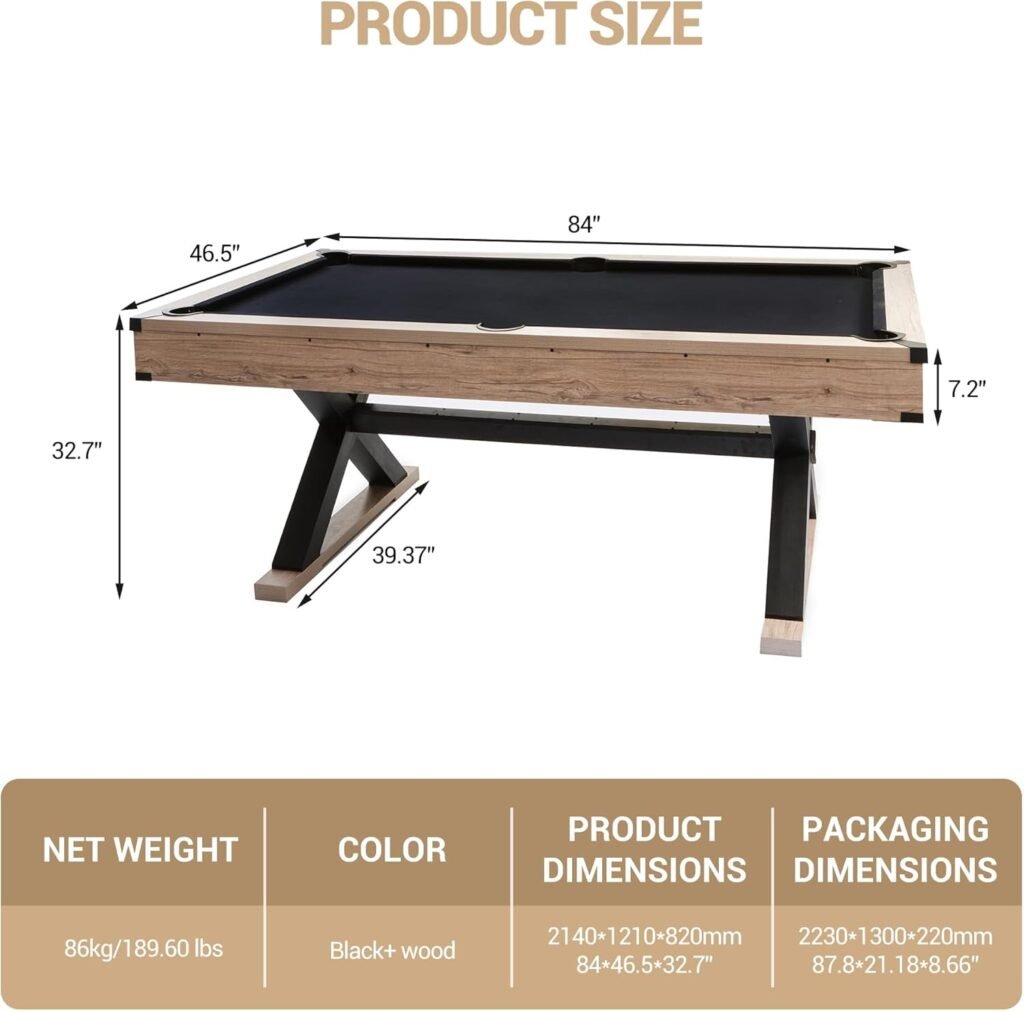 Billiard Table with 2 Cue Sticks, Billiard Balls, Cues, Cleaning Brush, X-Legs, Black Cloth, Rustic Grey, 84″ L x 46.5″ W x 32.7″ H